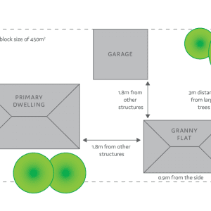 - The granny flat must maintain a distance of 3.0m from any existing trees that are over 4m in height